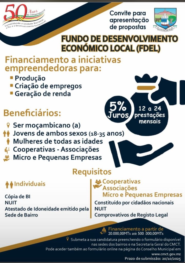 O Conselho Municipal convida todos os cidadãos a apresentarem propostas para financiamento de iniciativas empreendedoras no âmbito do Fundo de Desenvolvimento Económico Local (FDEL). Este programa tem como objetivo promover a produção, criar empregos e gerar renda nas comunidades locais, fortalecendo assim o desenvolvimento sustentável. Quem pode beneficiar? •Cidadãos moçambicanos(as); •Jovens de ambos os […]